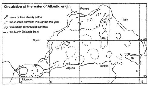 - Incoming Atlantic water masses often move north at the Straits of Sicily and take a reverse path back towards the Alboran Sea along the northern coast of the Western Mediterranean (Fig.3a). From this we might deduce that the most likely dispersion direction for drifting pelagic larvae and juveniles in the western Mediterranean, is from east to west in the north and vice versa in the south.