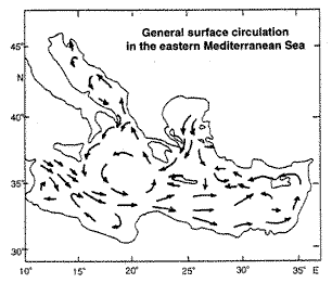 - Water masses entering the eastern Mediterranean move southeast along the African coast and up around the Levant to enter the Aegean, warming in the process, presumably with similar implications as for the last-described area above (Fig.4b).