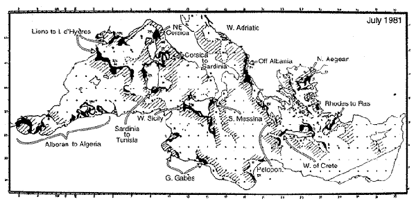Available information from oceanography throws some light on the behaviour of water masses, which may help better understand some characteristics of the whole Mediterranean basin, faunistically speaking. A gross simplification is that surface water enters from the Atlantic through the Straits of Gibraltar, and proceeds to the eastern Mediterranean, en route progressively losing nutrients and increasing in salinity through evaporation. It eventually passes back out to the Atlantic at depth through the Straits of Gibraltar to form the high saline component of the Atlantic circulation. Among the local exceptions to this general scheme are a north-south nutrient gradient due to incoming nutrients from northern rivers (the Rhone in the West, the Po into the Adriatic and Black Sea inflows through the Dardanelles into the Aegean). The effect of this gradient of nutrient availability and other anthropogenic effects on trends in fisheries production has been described by Caddy et al. (1995) and also seems borne out by analysis of GFCM Statistics (Fiorentini et al., 1997). Of immediate relevance from the point of view of a possible differentiation of local stocks is the observation (Le Vourch et al., 1992) that there are many small scale oceanographic features in the Mediterranean and that these seem relatively stable. Apart from gyres and fronts, such features that lead to stock separation may also include estuarine circulations, coastal embayments, etc.