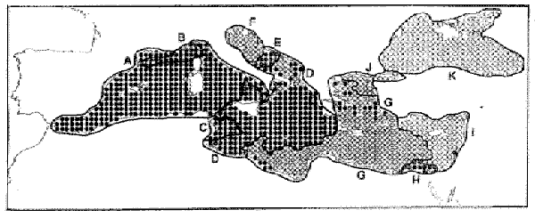 (b) The dissimilarity indices calculated from overlays of maps for 536 species occurring down to the 1 000-m isobath, suggested a series of discontinuities which might constitute faunal provinces (Fig.6a). These incidentally, tend to coincide spatially with the ten GFCM Mediterranean and Black Sea divisions used by GFCM (Fig.6b).