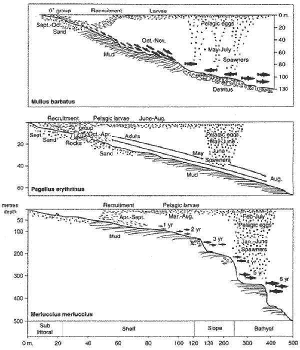 Fig. 7. Vertical displacements during life histories of 3 common demersal fish species(after Doumerge)