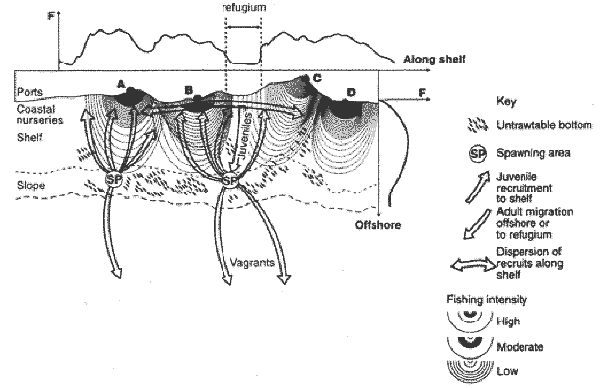 Given the geographical characteristics of the Mediterranean, with local occurrence of untrawlable bottom along narrow shelves and along the continental slope, some areas of shelf may be lightly fished. These may act as refugia allowing recruits to survive to reproductive size and move to adult distribution areas, often further offshore. The distribution of fishing effort on demersal resources is therefore probably concentrated on trawlable areas and in the vicinity of ports. Relatively few boats from Mediterranean ports exert distant water effort offshore from the local fishing grounds of other countries, and fishing effort on the deeper shelf and slope is constrained by bottom topography, except for long line and trammel nets. Such a situation, even if at present largely inferential, supports the utility of creation of `corridors' or closed areas or marine parks between adjacent ports. In addition to improving escapement, these would reduce conflict between vessels from adjacent ports and might provide the basis for separating individual fishing zones along the shelf within which limited effort quotas could be allocated without risk of overlap.