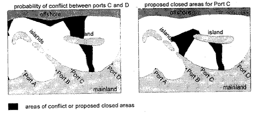 Figs 9b and 9c. Probabilities of conflict between vessels from 4 adjacent ports given the ports in Fig. 9a. Areas where a roughly equal share (40-60%) of effort is predicted to come from adjacent ports are delineated in dark grey.