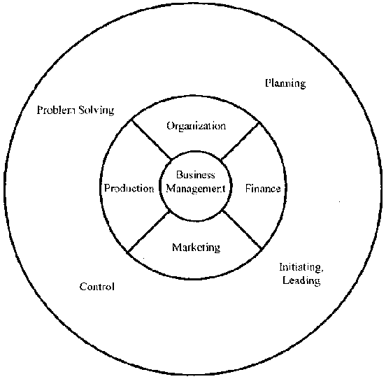 3. Facilitator draws up the diagram of Visual Aid 3-1 and explains that the inner circle in the diagram shows the aspects (production. marketing organization, finance) that have to be managed and the outer circle shows the management skills that are required to manage the aspects properly.