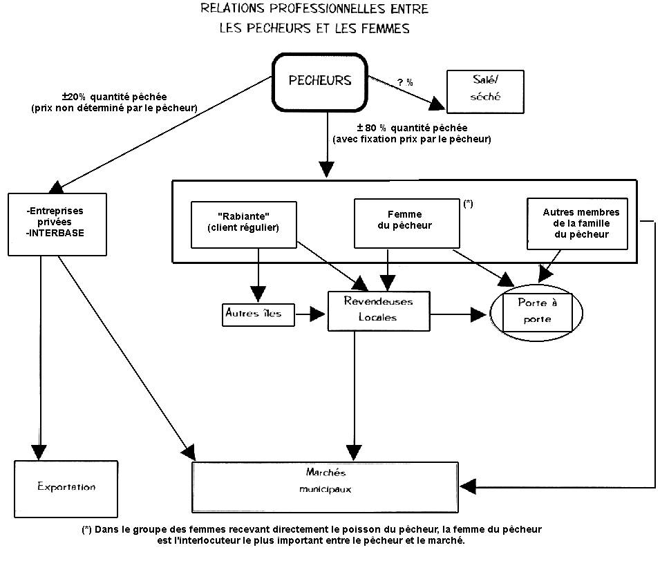 En effet, dans la plupart des îles sauf à Fogo, lorsque le pêcheur revient de la pêche, il discute avec sa femme ou une femme de confiance membre ou très proche de la famille pour établir un prix pour le poisson - quelque soit le type - selon les saisons, selon la quantité prise par l'ensemble des pêcheurs dans un village donné. Cette femme - en général celle du propriétaire - a pour mission, soit directement sur la plage soit au marché, de vendre le poisson aux autres femmes qui sont des revendeuses professionnelles ou des revendeuses d'occasion. De plus en plus, on voit apparaître dans le circuit des femmes qui n'ont aucun lien de parenté avec un pêcheur.