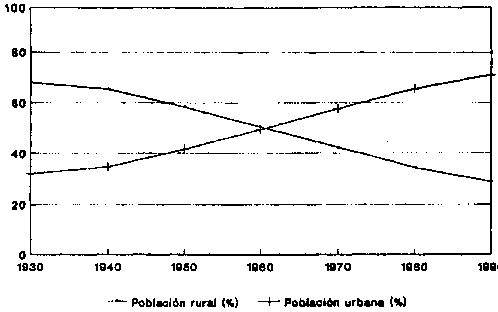 La evolución de la población rural2 en América Latina y el Caribe se ha caracterizado por un continuo decrecimiento respecto de la población total: mientras que en 1930, casi 70% de la población habitaba en centros rurales, en 1990 cerca de 30% de los latinoamericanos viven en áreas rurales (gráfico 1). En términos absolutos, de los aproximadamente 440 millones de habitantes de la Región, 124 millones habitan en áreas rurales (J. Chackiel y M. Villa, 1992).