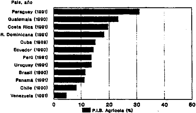 A partir de 1991, se registró una clara mejoría de la situación económica general de la Región. La contribución de la agricultura a este mejoramiento fue irregular. De hecho, los mayores aumentos de la actividad económica se produjeron en países exportadora. de petróleo, que se beneficiaron de su auge temporal en 1990/1991. Los resultados en aquellos países con una mayor orientación agrícola fueron desiguales. Claramente, los aumentos en el PIB en Chile, Ecuador y El Salvador se debieron en gran parte a la agricultura. Sin embargo, la caída de la producción agrícola fue en parte responsable del descenso del PIB en Costa Rica y de la disminución de la producción efectiva en Haití. La contribución económica de las exportaciones del sector agrícola también fue desigual. Los datos preliminares para 1991 indican que los ingresos derivados de las exportaciones agrícolas pueden haber disminuido ligeramente en relación a 1990 (FAO 1992a).