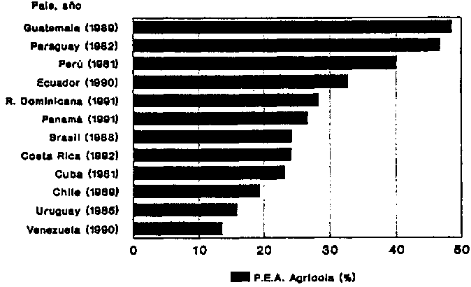 Respecto de la composición de la PEA, los trabajadores del sector agrícola dejaron de ser mayoritarios: en 1950, 55% de la PEA se dedicaba a actividades agrícolas; a fines de la década de los ochenta este porcentaje disminuyó a 25%. La disminución de la PEA agrícola no afectó su composición interna, en términos de sector moderno y campesino, representando el primero alrededor de 40% del total (PREALC, 1991).