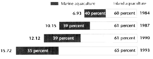 People have been farming fish for thousands of years. But today aquaculture has become big business in Asia, Latin America, North America and Europe. In 1994, world aquaculture production was worth US$39,000 million. Whether in large ponds, sea cages or tiny backyard ponds, aquaculture holds much promise for meeting increasing food demands. In fact, with most capture fisheries in decline, aquaculture is the best way to maintain and increase supplies of marine and freshwater fish.