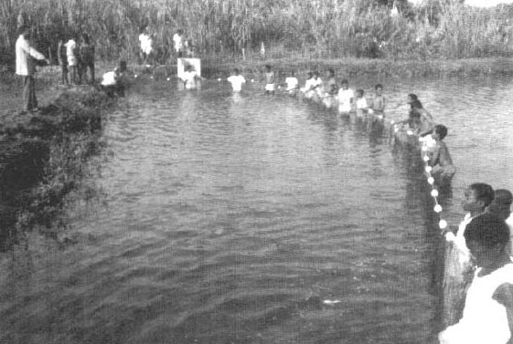 Trainer teaches how to harvest fish from reservoir.