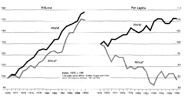 While SSA's food self-sufficiency stood at 98 percent in 1961, it had declined to 78 percent by 1978 and the situation has not improved since then. In fact, food production in Africa continues to grow more slowly than population. In contrast to every other region of the world, per capita food production has declined since the 1960s.