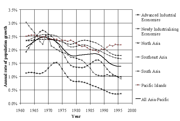Figure 13: Rates of population growth in the Asia-Pacific region 1962-1996