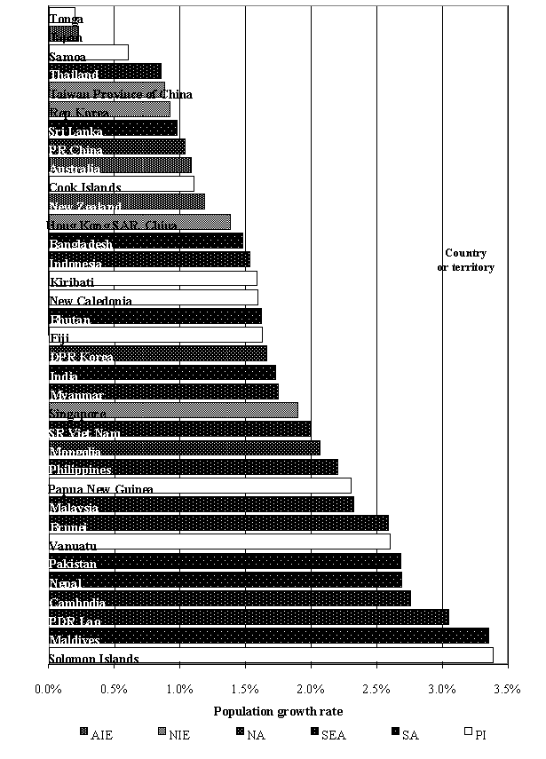 Within the sub-regions, there is considerable variation between population growth rates in different countries (see Figure 14). For example, in South Asia, Sri Lanka's rate of population growth is well below the average; Bangladesh and India are close to the average, but Pakistan, Nepal and the Maldives are well above it. Similarly, in Southeast Asia, there is a two percentage point difference between the rate of population growth in Thailand and the rates in Cambodia and the People's Democratic Republic of Lao (more detailed information about population on an individual country basis can be found in Annex 2). With one or two exceptions (most notably Singapore and Malaysia), the relatively more prosperous countries and territories in the region have lower population growth rates.