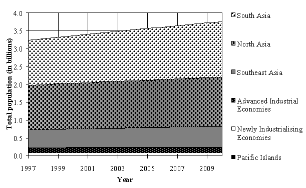 The current distribution of population in the Asia-Pacific region is shown in Figure 11. Over three-quarters of the region's population live in the North Asia and South Asia sub-regions and a further 15% live in Southeast Asia. The relatively more prosperous Advanced Industrial Economies and Newly Industrialising Economies account for less than 10% of the region's population and the Pacific Islands account for less than 1%.