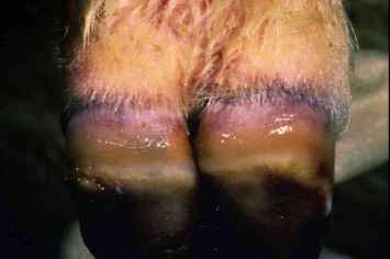 Note the bluish discoloration of the coronary bands of the hoof. The lips