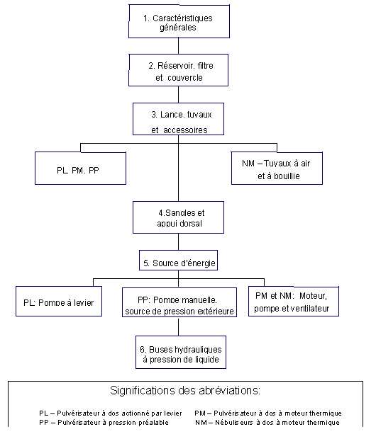 Chaque module se réfère à un composant principal ou à un groupe de composants fonctionnels à partir desquels les caractéristiques concernant les pulvérisateurs complets peuvent être logiquement réunies. Les différents éléments composants les pulvérisateurs portables sont présentés dans la Figure 1.