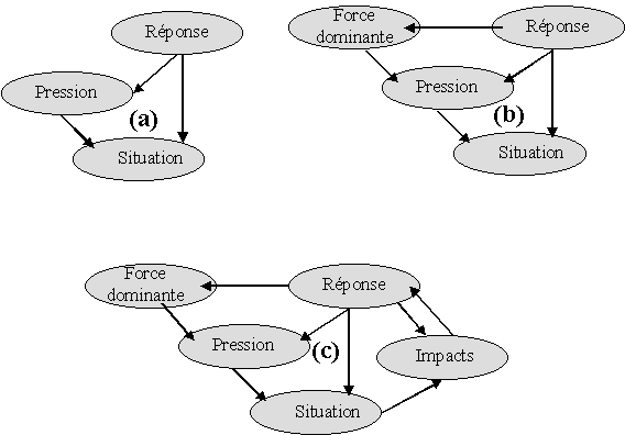 Figure 4. Les schémas PSR (a), DPSR (b) et DPSIR (c)