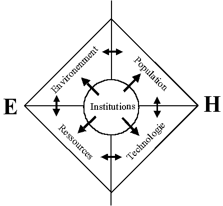 Le sous-système humain exerce une pression complexe sur le sous-système environnemental que, par exemple, il pollue et appauvrit, et il reçoit des signaux en retour. Les deux sous-systèmes peuvent être à leur tour subdivisés en composantes secondaires et leurs corrélations mises en évidence. Par exemple, les composantes «économie» et «population» du sous-système humain donnent lieu à des échanges de biens et services, ainsi que de main-d'_uvre.