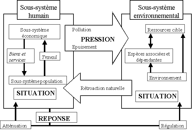 Le schéma force dominante-pression-situation-impact-réponse (DPSIR) (figure 5) est un exemple d'un tel élargissement du schéma PSR pour lequel on considère que les "forces dominantes" reflètent plus précisément les dimensions économiques, sociales et institutionnelles du développement durable. Dans ce cadre élargi, les forces dominantes humaines (par exemple la demande de nourriture et celle de revenus, alimentées par les forces économiques et démographiques) exercent une pression sur l'environnement (au sens large, comprenant l'utilisation des ressources naturelles, l'impact sur l'habitat, les émissions de déchets). Ces pressions entraînent des modifications de la situation des composantes du système et son environnement (telles qu'une diminution de la biomasse des ressources ou des revenus pour les communautés côtières) et elles peuvent avoir un impact immédiat sur le fonctionnement du système (tel que l'effondrement de pêcheries, des troubles sociaux, une moins bonne observation des réglementations). Les sociétés, par exemple par l'intermédiaire de leurs services responsables de l'aménagement, fournissent une réponse à ces modifications de l'état des ressources et leur impact (par exemple: mesures juridiques, institutionnelles et/ou financières, modification des stratégies de développement ou des systèmes fonciers) en vue de modifier la pression exercée (par le moyen de l'aménagement) ou d'en réduire les effets (plans de restauration ou dispositifs d'intervention, programmes d'assurance, etc.).