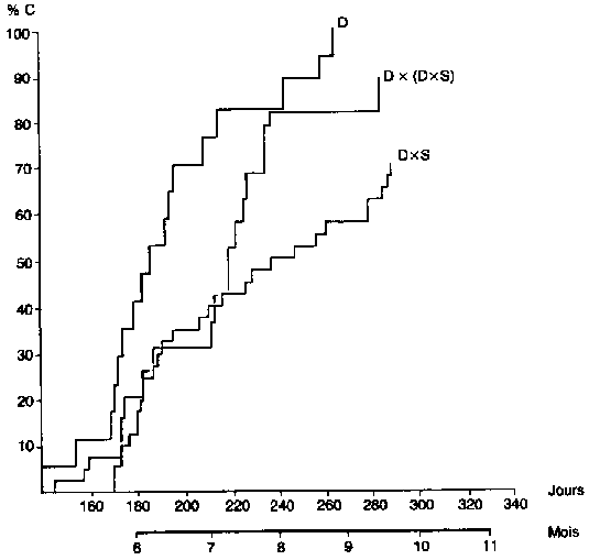 Figure 7. Pourcentages cumulés des âges à la première ovulation des agnelles D, DxS et Dx (DxS)