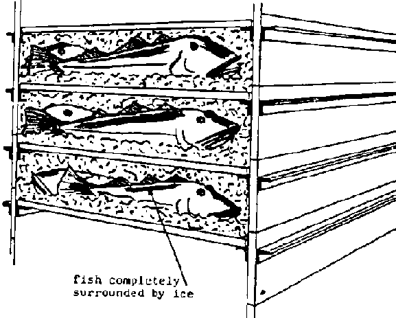 The boxes should be stacked on battens to keep them clear of the fishroom floor; the air spaces between the floor battens can be filled with ice if there is little or no insulation on the floor. Similarly, if bulkheads and ship's sides are not well insulated, the tiers of boxes should be supported clear of bulkheads and linings, and the spaces between support battens filled with ice.