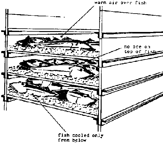 If the fish are shelfed in the bottom shelf of a pound, there is unlikely to be room for sufficient ice beneath the fish; the fishroom floor can conduct enough heat to melt away the bed of ice before the fish are landed, leaving them unprotected and open to more rapid spoilage.