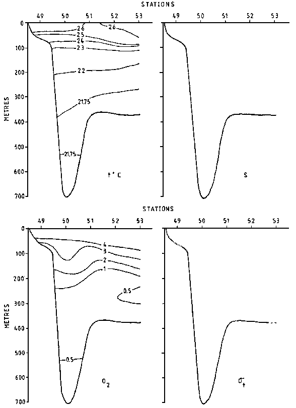 Hydrography was observed in two sections, one off the southern and one off the northern part of the coast. These sections are shown in Figs 4.2 and 4.3 respectively. Only temperature and dissolved oxygen content could be presented since salinometer tables for salinities above 39 units were not available onboard the ship.