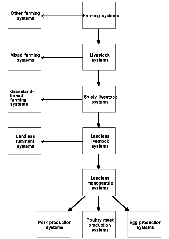 The delineation of Landless Livestock Monogastric production systems (LLM systems), as proposed by Sere & Steinfeld (1995), is schematically given in Figure 1 and explained below. Livestock systems are defined as a subset of farming systems, in which livestock contributes more than 10% to total farm output in monetary terms, or in which intermediate contributions of animal origin (e.g. animal traction, manure) represent more than 10% of the total value of purchased inputs. Within livestock systems, mixed farming systems and solely livestock systems are distinguished. For the delineation of LLM system, the definition of the latter is important: solely livestock systems are livestock systems in which more than 90% of the dry matter fed to animals comes from rangelands, pastures, annual forages or purchased feeds, and less than 10% of the total value of agricultural production comes from non-livestock farming activities. Solely livestock systems can either be grassland-based or landless. Landless livestock systems are defined as a subset of the solely livestock systems, in which less than 10% of the dry matter fed to animals is farm produced, and in which annual average stocking rates are above 10 livestock units (LU) per hectare of agricultural land1. Contrary to mixed and grassland-based farming systems, landless farming systems were not assigned to agro-ecological zones or to World Regions (a term used by FAO for the purpose of this study). In this respect, landless livestock systems are unique in the sense that in principle they can occur in all world regions. Finally we arrive at LLM systems by defining these systems as a subset of landless systems, in which the monetary value of outputs of the pig or poultry enterprise is higher than that of the ruminant enterprise. Within LLM systems, three subsystems can be distinguished: a subsystem in which pork is the end product, a subsystem in which poultry meat is the end product and a subsystem in which eggs are the end product.
