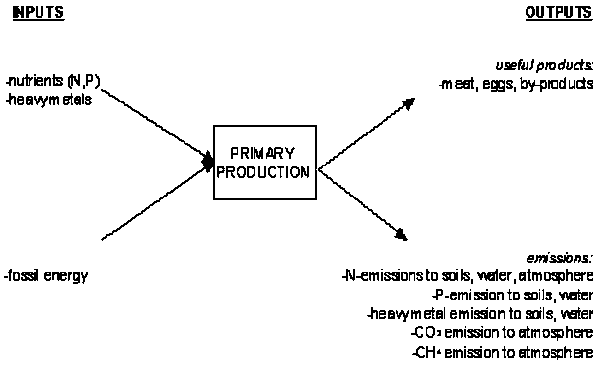 Emissions may be defined as flows, leaving the production environment and entering the external environment (soil, water, atmosphere). Most emissions are from manure, during storage or after application on soils. Emissions mainly result from the use of the main inputs in LLM system: fossil energy and concentrates. In Figure 2, the most important potentially polluting inputs and emissions are schematically given. The production of the inputs themselves has an environmental impact as well.