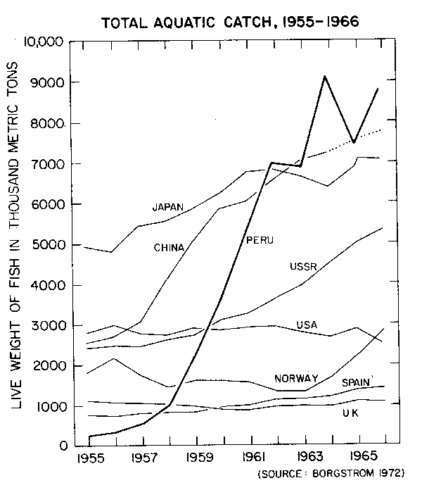 3 El Niño was not the only climate-related anomaly to occur in 1972, but was one of a set of events that had a deleterious effect on the global food production system as well as on the perceptions about the system's ability to feed its members (Garcia, 1981). The USSR, for example, registered one of its worst shortfalls in grain production as a result of drought (Katz, 1973), and resorted to major grain imports from the USA (Trager, 1975); this in turn contributed to a scarcity of wheat on the world market. That year droughts also occurred in Central America, the Sahelian zone of West Africa, India, the People's Republic of China, and in parts of Australia and Kenya (FAO, 1974). As a result of the 1972 anomalies, along with other socioeconomic factors (such as the impacts of, as well as reactions to, those anomalies), global per capita food production and global food reserves declined for the first time in more than twenty years (Brown, 1974). In addition to these events and the decline in Peruvian fish landings, there was a simultaneous decline in fish landings in other regions,challenging the assumption that the oceans would be a source of food that could supplement agricultural production to feed the growing populations of the world (see, for example, Thompson, 1977).