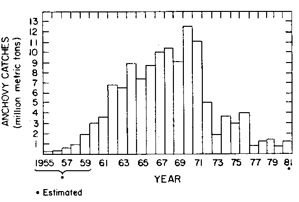 In fact, the high level of fishing activity in 1972 obscured the poor state of the stock and the initial effects of E1 Niño, leading eventually to a sharp decline in the Peruvian catch, in fishmeal exports, and to adverse changes in Peru's balance of payments. peru's anchoveta catch, on which its, economy had to a large extent become dependent for foreign exchange, from an all-time high of 12.4 MMT (officially reported) in 1970 to less than 2 MMT in 1973. In the next three years the anchoveta catch did not go above 4 MMT. In 1977 thefishery was closed in the spring and a ban was placed on fishing anchoveta for the year.