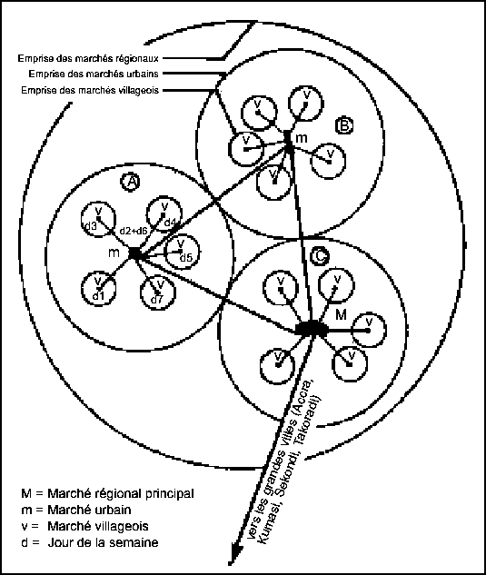 Dans un tel système, les populations des centres de plus faible attraction (par exemple un village) s'adressent au niveau immédiatement supérieur pour s'approvisionner en services plus spécialisés (par exemple un bourg), et elles iront jusqu'au sommet de la hiérarchie pour obtenir des services universitaires ou plus particulièrement spécifiques (par exemple une préfecture ou la capitale). Au niveau le plus bas, il ne s'agira que de marchés périodiques fonctionnant un seul jour par semaine. La figure 11 montre une hiérarchie typique des marchés périodiques dans la Upper Region au Ghana.