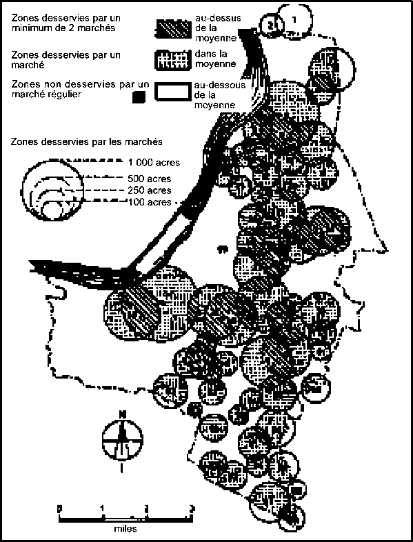 Quand il s'agit de choisir un emplacement commercial, il faut s'attacher à trouver un équilibre entre le désir évident des commerçants de maximiser leurs gains et le désir non moins évident des consommateurs de disposer d'un vaste choix de produits et de services à des prix raisonnables, non loin de chez eux. C'est donc en tenant compte de ces deux facteurs qu'il faut faire un choix. Il faut toutefois considérer qu'un groupe de commerces ou de stands de marché attirent en général plus de monde qu'un magasin isolé. On aura donc, dans les zones périphériques, de vastes étendues urbanisées moins bien desservies, parce que moins peuplées. La figure 18 montre un exemple de zones desservies par les marchés urbains à Calcutta, basées sur une analyse des aires d'influence urbaines.