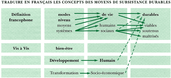 Dimensions culturelles. Le cadre relatif à des moyens de subsistance durables repose pour une grande part sur l'expérience acquise dans des pays anglophones. Les praticiens francophones et hispanophones se heurtent à certaines difficultés pour travailler sur la base de concepts comme "livelihoods" (moyens de subsistance durables) qu'il est difficile de faire passer en un mot dans leur langue. En même temps, il existe un corps important d'expériences menées dans des pays hispanophones et francophones sur les mêmes thèmes mais qui ont, peut-être, été conceptualisées différemment. Il faut trouver comment incorporer cette expérience dans le cadre pour en créer des formes culturellement plus appropriées. Bien que l'on puisse traduire sustainable livelihoods en espagnol par les termes sistemas de vida y desarollo sostenible, il ne semble pas y avoir d'équivalent français adapté. En fait, aucune des traductions en français citées ci-dessous ne rend compte de l'intégralité du concept.