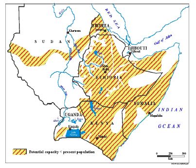 The result is that, throughout the region, farmers have to cope with reduced productivity and less land from which to feed themselves and to supply food to the ever-expanding cities. In many parts of the region, the pressure of the human and livestock populations on the resource base has increased to the point where land use, employing currently available technology and management systems, is not sustainable. This is particularly true in the arid and semi-arid lands which make up 70 percent of the region and where the resource base is fragile. A FAO study from 1982 11 shows that, even then (with data from the mid-1970s), for most of the region population exceeded estimated long-term carrying capacity (see Map 3).