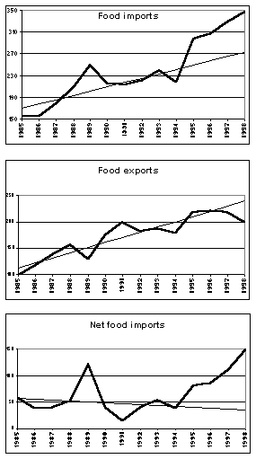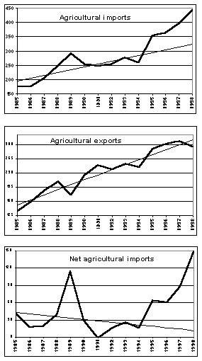 Figure 1 shows the evolution of agricultural trade during 1985-98 and the trend up to 1994, extrapolated up to 1998. Total agricultural imports increased rapidly during 1985-94, at the linear rate of US$10 million per year. In the post-94 period, they rose sharply (36 percent) in 1995 and continued to rise, by 3-12 percent, in the following years. As a result, the average value of imports in 1995-98 was 50 percent higher than in 1990-94 and still 26 percent higher than the extrapolated trend value, despite the fact that the trend was strongly positive (Table 3).
