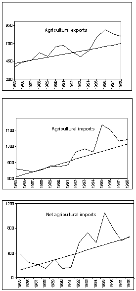 The agricultural trade balance has consequently been in constant deficit during 1990-98. In 1995-98, net imports averaged an annual US$780 million, which was about 78 percent higher than in 1990-94 and 32 percent higher than the level expected on the basis of the extrapolated trend.