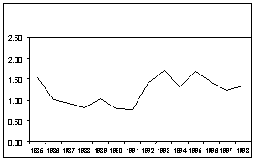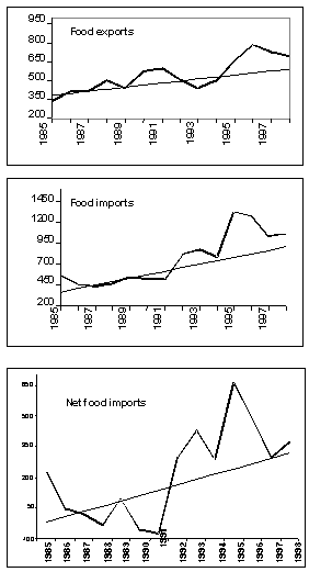 Figure 3 shows how food imports have varied annually in relation to total agricultural exports. In 1985-87, the ratio was about 1.2, i.e. food imports were 1.2 times agricultural exports. Thereafter, the ratio fell to about 0.8 in 1990-91, rose to 1.34 in 1992 and 1.7 in 1995 before falling slightly in 1996 and 1997. The average value for 1995-98 was 1.42, about 20 per cent higher than in 1990-94, but 47 percent below when compared with the trend. In other words, there was a clear deterioration in the balance between food imports and total agricultural exports during 1995-98 compared with the previous five years.