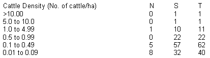 The national density was roughly 0.81 cattle per ha. Going by the 1982 figure of 260 million heads of cattle. Source: Kothari etal, 1989