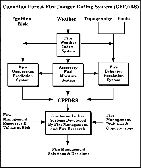 The Canadian Forest Fire Danger Rating System (CFFDRS) is one of the few systems in the world that is implemented across an entire country (Alexander et al. 1996). It has two primary subsystems (Figure 1)-the Fire Weather Index (FWI) System and the Fire Behavior Prediction (FBP) System (Stocks et al. 1989). The CFFDRS is the principal source of fire intelligence in Canada and is fundamental to fire-management operations at strategic and tactical levels, from prevention to fire-fighter safety. The development of a national forest-fire danger-rating system for Canada faced many challenges. Canada is a large country with fire environments that range from rain forest and taiga to grassland and semi-desert. Land-management objectives, the importance of fire, and the resources available for fire management, vary widely across the country. The national government has a limited role in forest management and must work cooperatively with provincial and territorial agencies to implement national programs, rather than act unilaterally.