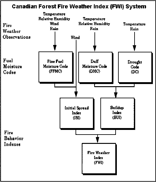 Research on fire danger began in Canada in the 1930s and resulted in the development of a number of regional fire-danger tables. Fire research was greatly expanded during the 1960s, and in 1967 a modular, national, fire-danger rating system was proposed to replace various regional systems. The Fine Fuel Moisture Code (FFMC) was developed to represent the moisture content of surface litter, which is important to ignition and fire spread. The Duff Moisture Code (DMC) and Drought Code (DC) were developed to represent the moisture content of shallow and deep organic layers, respectively. These organic layers are important to surface fire intensity, crowning potential, and difficulty of control in temperate and boreal coniferous forests. Three fire-behavior indexes-the Initial Spread Index (ISI), Buildup Index (BUI, and Fire Weather Index (FWI)-were developed and scaled in relation to fire behavior observations of small-scale test fires in a standard, jack pine fuel type (Van Wagner 1987), but can be correlated with fire behavior in other fuel types. All of the FWI System values are calculated from four simple weather observations-temperature, relative humidity, wind speed, and 24-h precipitation at noon local standard time; however, the values represent conditions at around 1600 hours, which is the peak fire danger period (Van Wagner 1987).