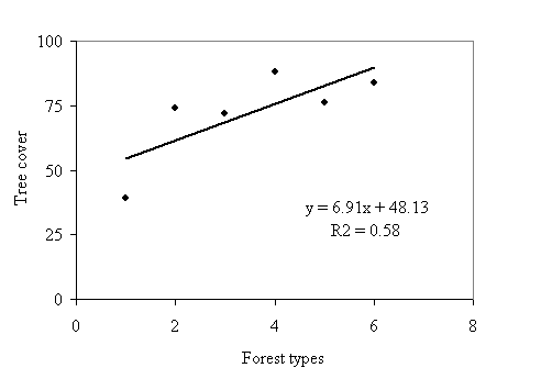 Species richness was analyzed for single factors Analysis of Variance (ANOVA) following Steel and Torrie (1981). Linear correlation was developed for forest types and tree cover, tree cover and species richness. Correlation coefficient was also determined for various richness and diversity parameters.