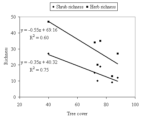 The tree crown cover was lowest in P. roxburghii -mixed broadleaf forest and maximum in Q. floribunda and Q. semecarpifolia forest. The shrub cover decreased with increasing tree cover while there is no relationship between tree and herb cover. The total species richness decreased for tree, shrub and herb with increasing tree cover. Collins and Pickett (1987) reported that canopy disturbance frequently enhances plant biodiversity. This enhanced biodiversity could be related to environmental heterogeneity in the form of patchy light availability (Bellingham et al. 1996), spatial heterogeneity in soil resources (Borann et al. 1995, Denslaw et al. 1998) and local deposition of fallen trees (Everham & Brokaw 1996). Alternatively, the increased diversity could be caused by addition of colonizing species to a disturbed community, regardless of environmental heterogeneity- as long as the number of colonizing species exceeds the number of species lost to the disturbance (Palmer et al. 2000). The forest will be less protective if the canopy is concentrated only at the top. However, if the top layer trees are supported by deep and dense canopies in lower strata, the vegetation will be more protective (Singh & Singh 1986).