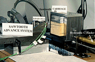 Individual teeth with stellite tips (Table 1) were cut from bandsaw sections provided by The Experimental University of Guayana, Upata, Venezuela, and mounted on a three-axis piezoelectric load cell to measure principal, lateral, and normal forces. The block of wood was propelled past the sawtooth in a straight line at a speed of 1.34 to 1.50 m/s (53-59 in/s) by a hydraulic cylinder. A precise sawtooth advance system provided desired chip thickness.