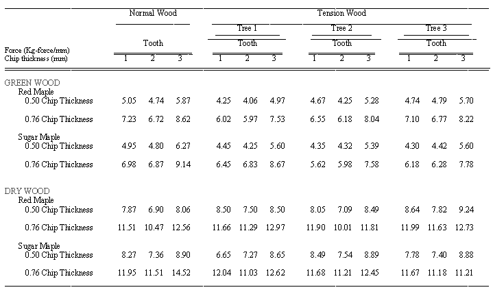 No differences in lateral force were found between normal and tension wood of both species, but we found significant differences in lateral force with respect to chip thickness. For red maple the force is greater for thicker chips. For dry sugar maple no differences were found; however, in green condition the thicker the chip, the larger the lateral force. Frozen and dry sugar maple generated the same lateral force results, but frozen red maple generated greater lateral force (statistically significant) than dry red maple only for chip thickness 0.50 mm.