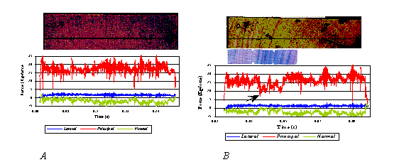 Figure 2. Relationship between chip quality (top) and cutting forces for dry normal wood of sugar maple (A) and green normal wood of red maple (B). In A the compressed central portion of the chip corresponds to lower principal cutting forces (red data) and normal forces (purple data) that became positive (the tooth was repelled by the wood). In B principal and normal cutting forces were uniform along the cut and the chip is smooth.