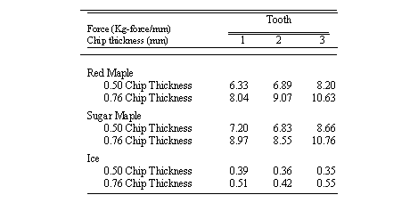 Specific principal cutting force. Average specific principal cutting forces are in Table 2. The maximum value for sugar maple was 14.93 kg-force/mm (2.8 % greater than the avg.) when cutting dry normal wood with sawtooth 3 at a chip thickness of 0.76 mm. Maximum value for red maple was 14.25 kg-force/mm (10.7 % greater than the avg.) for cutting dry tension wood (tree 3) with sawtooth 3 at 0.76 mm chip thickness. Dry wood requires more energy to cut. Rubbing on the tooth back occurs with low clearance angle, which increases cutting force. Low or negative rake angles increase cutting forces (Kivimaa 1950, Franz 1958, and Woodson 1979). A corner of sawtooth 1 broke (600 X 400 X 150 μm) cutting the first dry block.