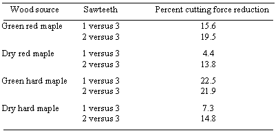 The sawteeth with larger rake angles cut green red and sugar maple with 20% less force than the sawtooth with lower rake angle. For dry wood, cutting force was about 14% less. Surfaces produced with larger rake angles were smoother, especially when cutting green tension wood. However, for dry tension wood the smaller rake angle cut the wood with crushed cells on the surface, making the surface appear smoother; but below the cutting plane, it split the wood parallel to the grain. The 35.1° tooth registered the lowest specific principal cutting force.