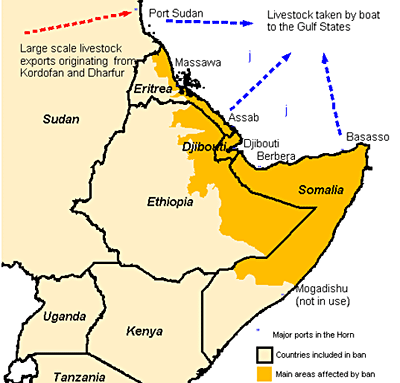 For the second time in less than three years livestock producers and traders in the Greater Horn of Africa are facing the devastating consequences of Rift Valley fever (RVF). An outbreak of RVF in southern Saudi Arabia and Yemen (the first reported outside Africa) in September and October 2000 has left dozens of people dead and hundreds infected. As a consequence six Gulf States - Saudi Arabia, Bahrain, Oman, Qatar, Yemen and the United Arab Emirates - have now banned livestock imports from nine African countries, principally in the Horn. Although RVF is endemic in the affected countries (see map) none has reported a recent RVF epidemic. Although they are therefore not experiencing the direct impacts of the disease, the livestock trade embargo will undermine a precarious regional food security situation.