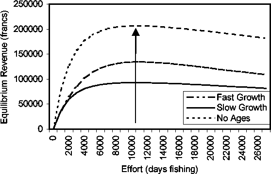 It was observed that the fleet is operating close to the bio-economic equilibrium at current recruitment levels. This implies that at current levels of biomass and effort, resource rent is being lost. Improvements in resource rent would require limiting access and reducing the number of fishing days. The level of effort that maximised the net present value of the fishery was estimated to be 23000 fishing days.
